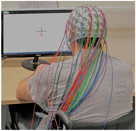 Setup for EEG recording. The downward arrow is the cue to perform motor imagery of the legs. The picture was taken with written consent from the participant.
