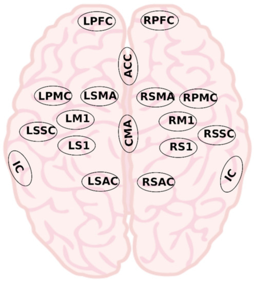 The source time series was then averaged over voxels in 17 regions of interest, spanning sensorimotor and pain areas of the cortex, as shown in Figure 3 [44]. The leg primary motor cortex (M1) and primary sensory cortex (S1) areas were not considered specifically, rather the entire M1 and S1 were included. There were several reasons for this choice. Firstly, the M1 region of legs is located deeper in the central sulcus which limits spatial precision. Previous studies in the field such as Gustin et al. found activation of the M1 leg area during a leg motor imagery task [12]. However, those are fMRI studies which have a high spatial resolution, whereas this is an EEG study with lower spatial resolution. To get reasonable resolution, a source reconstruction method was used, which can be more accurate if subject-specific MRI is used to create a forward model. Since a standard MRI was used, we could not be sure that the same voxel locations would represent leg area in all participants. Secondly, in a study with chronic SCI participants, we showed that the presence of CNP affects sensorimotor cortex globally, thus, to increase the sensitivity of the analysis, the general M1 was considered [13]. Thirdly, movement activation patterns change post SCI as the brain reorganizes, such as lateral and medial shifts in activation [14].