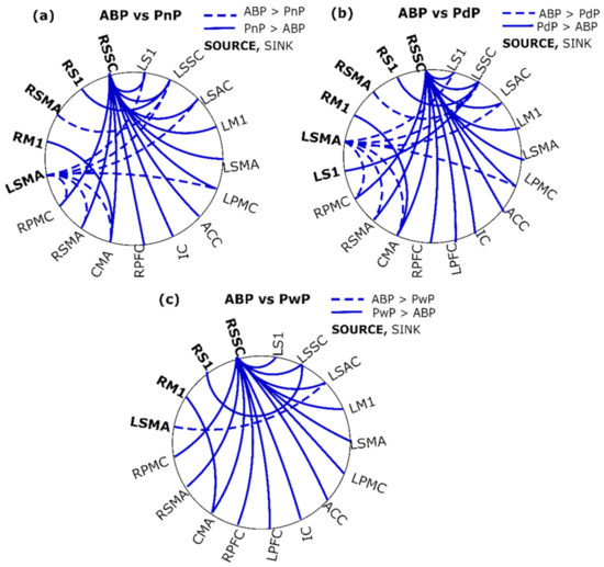 Significant differences in connectivity between able-bodied participants (ABP) and SCI groups: (a) PnP, (b) PdP, and (c) PwP. The SCI groups PwP, PnP, and PdP represent SCI participants with CNP at the time of recording, those who did not have CNP at the time of recording and remained CNP-free, and those who did not have CNP at the time of recording but developed CNP later. The solid lines indicate that the second group has greater connectivity than the first group, whereas the dashed lines indicate the opposite. Source areas are marked in bold whereas sink areas are non-bold.