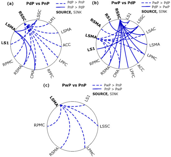 Significant differences in connectivity between SCI groups: (a) PdP vs. PnP, (b) PwP vs. PdP, and (c) PwP vs. PnP. PwP, PnP, and PdP represent SCI participants with CNP at the time of recording, those who did not have CNP at the time of recording and remained CNP-free, and those who did not have CNP at the time of recording but developed CNP later. The solid lines indicate that the second group has greater connectivity than the first group, whereas the dashed lines indicate the opposite. Source areas are marked in bold whereas sink areas are non-bold.