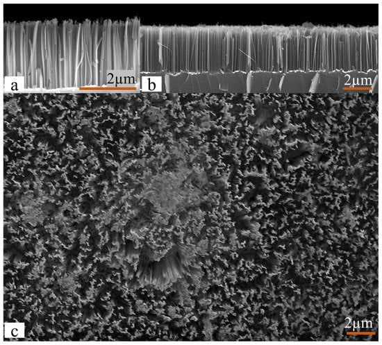 SEM image of SiNWs etched for 7 (a), high-magnification cross-section of the same image (b), and (c) top-view SEM image of SiNWs etched for 7 .