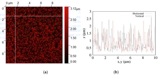 (a) Gwyddion analysis of top-view SEM image in (100 μm2). (b) Two Gwyddion line-scans of the figure to the left (red color—horizontal axis, black color—vertical axis).
