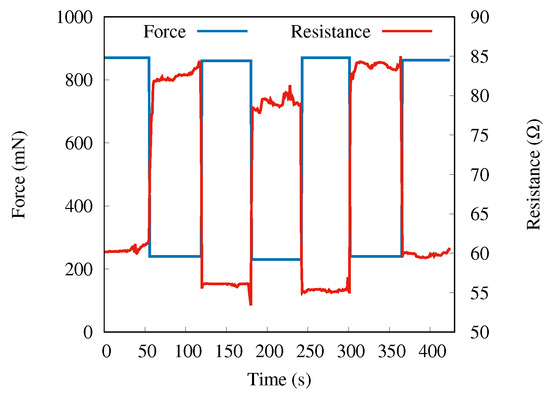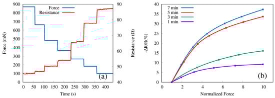 The force and the instantaneous resistance measured after applying the force to the sample with nanowires of length 3 μm (etched for 7 ) are shown in Figure 4a as a function of time. The maximum force was applied at the beginning (time zero) and then reduced step-wise while the resistance was being measured. Each force level was kept constant for roughly 50 s to confirm that the resistance value was stable with time. As clearly visible, the resistance changes significantly and inversely with pressure.