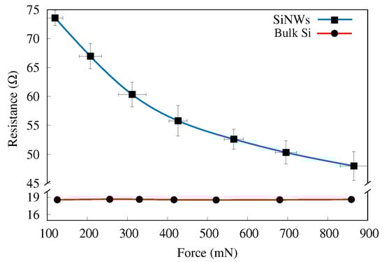 In Figure 5, the resistance versus applied force is shown again for sample D (blue line), now compared with the case of the bulk Si (red line). For this measurement, we replicated sample D four times, in the same conditions of a 7 min etching time, and performed the measurements on each sample replica. These measurements have been performed to test the repeatability of the sensor’s response in the same conditions as have been performed in Figure 4a. It is worth noting that the un-uniform step size observed in Figure 4a is due to the manually adjustable screw of the force meter shown in the schematic. The data displayed are average values measured on these samples (D-like), shown with the error bars. A striking difference between these two configurations (SiNWs vs. bulk Si) is observed. No measurable change in resistance is seen for the bulk Si, in very sharp contrast to the SiNWs sample.