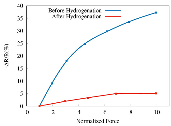 Hydrogenation (exposure to hydrogen plasma) is widely used in the electronic industry to increase the mobility of charge carriers in semiconductors. It neutralizes deep and shallow defects and charged surface states [31,32]. Because the PZR effect has been attributed to surface states, we applied a hydrogenation treatment in order to explore the origin of the PZR effect in SiNWs. For hydrogen plasma treatment, we used a custom-built inductively coupled discharge setup with cylindrical geometry (290 long quartz tube with a diameter of 34 ). The quartz tube was held inside a circular copper inductive coil with a diameter of 54 . A radio-frequency power generator CERSAR (c) ( ) source coupled with an impedance-matching unit was utilized. For hydrogenation, a gas mixture of Ar/H2 (30/−70%) was used, and the throttle valves were adjusted to stabilize the gas pressure of 29 mbar. A more detailed description and schematic of the hydrogenation setup can be found elsewhere [33,34]. In Figure 7, we compare the behavior of sample D before and after the hydrogenation. The PZR effect decreases dramatically and can be attributed to the passivation of the surface states [35].