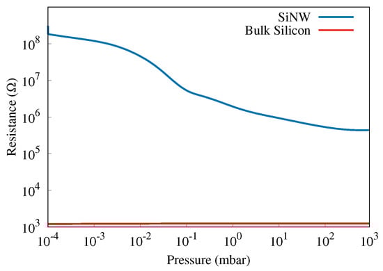 He et al. [13], who measured PZR coefficients of single (p-doped) SiNWs, with diameters 50 to 300 , made from wafers with resistivities of 0.003 cm to 10 cm, found that the PZR was roughly inversely proportional to the diameter and proportional to the wafer resistivity. For a similar diameter and wafer resistivity as in our present work, ~150 nm and 10 cm, respectively, the PZR coefficient for a single wire was of the order . (According to Figure 2d of Ref. [13]). Using Equation (3), with p = 0.28, = 49 mm2, F = , and = 0.35, we obtain ≈ , i.e., almost two orders of magnitude higher. Note that, in principle, Equation (2) does not depend on sample details, such as the number of nanowires or their configuration, which we believe plays a role in our case. Therefore, we attribute this higher value to a collective PZR effect brought about by the interaction between multiple and interconnected wires rather than the response of a single nanowire. Additionally, the pressure sensitivity of the sensor in the isostatic pressure variation given by [39], in the pressure range of to , is . It is also seen that the highest sensitivity (highest slope in Figure 8) is found in the pressure range of roughly and mbar where the sensitivity measure is .