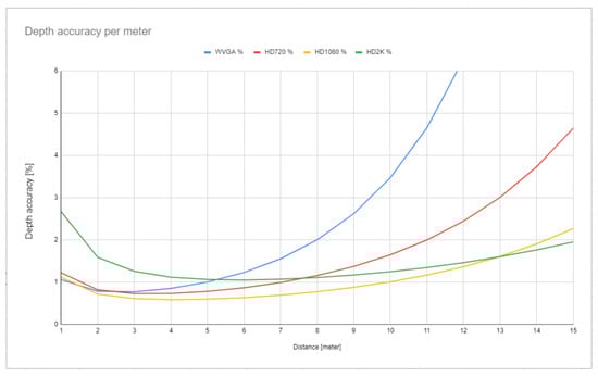 The ZED 2 stereo camera has a reported depth range of 20 m and a depth accuracy of <1% up to 3 m and <5% up to 15 m [26]. To determine the usefulness and usability of the camera for real-time applications, it was important to measure more accurately its depth precision and depth measurement consistency. A 3D checkerboard-based test method described by Fernandez et al. [27] and Ortiz et al. [28] was used to assess the depth measurement accuracy of the camera. The accuracy was determined for all four available resolutions of the camera at every meter between 1 and 20 m. The results (displayed up to 15 m) are shown on Figure 1. At a distance of 5 m, the accuracy was measured to be below 1% for every resolution. The HD1080 resolution had a measured accuracy below 1% up to 10 m and below 2.26% up to 15 m. Note, at a distance of 15 m, the HD720 resolution had an accuracy of 4.64%, while it was 1.95% for the HD2K resolution. The WVGA resolution passed the 5% accuracy threshold already around 11 m and had an accuracy of 16% at a distance of 15 m, making it very unreliable at long distances.