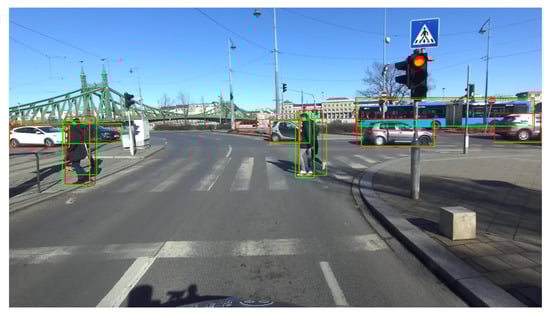The image acquisition happened on the road while the camera was mounted onto a test vehicle (see Figure 3 for a real example), in a garden with various objects present and inside a house. The goal of the image acquisition was to gather images in a broad spectrum, representing as many object classes the ZED 2 object detector could recognize as possible. After the recording of a dataset of 51 images, an online annotation tool was used to label the classes on the captured images, thus creating the ground-truth data for the object detection performance assessment. In total, 342 objects were labeled in the 51 images, belonging to 16 different classes. The assessment of the object detection performance was done by using the toolkit proposed by Padilla et al. [31]. The qualitative test process concluded that the ZED object detector had a measured mean average precision (mAP) value of 0.53 (IoU = 0.5) and a mean inference time of 51.74 ms.