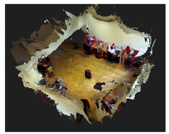 The system proposed by Sünderhauf et al. [12] gave a solution to the previously mentioned problem. It simultaneously built a 3D model of the environment and also created an object-oriented semantic map with a database. To provide more advanced scene understanding, bounding-box-based object detection and unsupervised 3D segmentation were combined with simultaneous localization and mapping. The building of the semantic map happened in a step called data association. It determined whether a detected object was already built into the map (hence only needing to update a previously saved map object) or whether it needed to be added as a new map object. The data association happened in two stages. For every detected object, the system queried the semantic object map to select previously saved objects whose point cloud centroids were below a predefined Euclidean distance threshold. Secondly, a nearest neighbor search was performed between the segmented 3D object point clouds (the detected object’s and the queried, already saved object’s point clouds) to calculate the Euclidean distance between the neighboring point pairs. If at least half of the associated 3D point pairs of the two object point clouds had a distance smaller than a predefined threshold, the detection was associated with an already-saved object in the semantic object map. According to their measurements, this process took around 30 ms for each comparison. Their work stopped at the built 3D semantic map and only gave future possibilities on how this map could be used. Still, this approach did not require previously built 3D models of the environment and the mapping and the building of the object database happened in real time.