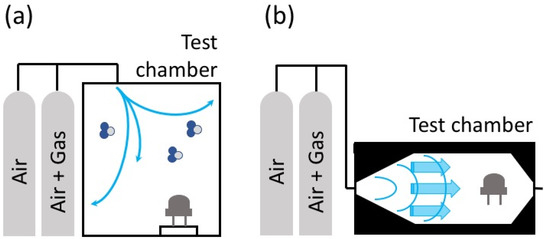 - dynamic, often named the ‘flow through method’, refers to those setups employing a constant flow of gas through the test chamber [50,59,60]. Mass flow controllers are used to mix fluxes from certified bottles and control the atmosphere composition inside the test chamber. In these setups, the atmosphere surrounding the devices is continuously renewed by the injected flow, both when the atmosphere composition is changed as well as when the composition is kept constant. During the gas injection process, the gas concentration inside the flow is kept constant at the desired value. The device is immediately exposed to the target concentration if it is under a direct flow; otherwise, if the chamber is designed to involve the diffusion process, these should take place before the desired concentration is established in proximity of the sensor device;