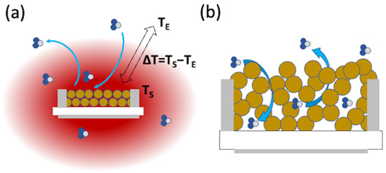 Schematic representation of diffusion phenomena occurring in proximity and through the metal oxide layer. (a) Diffusion through the temperature gradient surrounding sensors with an embedded heater owing to the difference between the sensor temperature (TS) and the environment temperature (TE); (b) diffusion through the pores of the metal oxide layer owing to the different gas concentrations in the environment and inside the sensing layer.