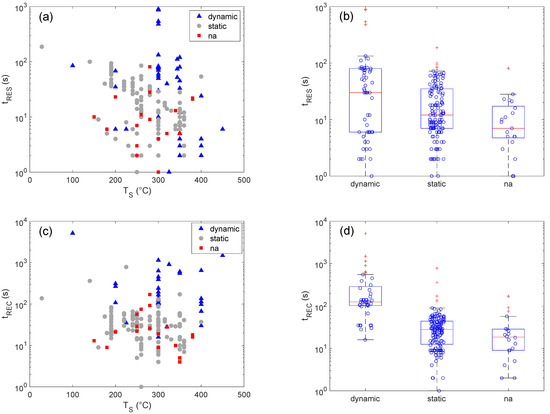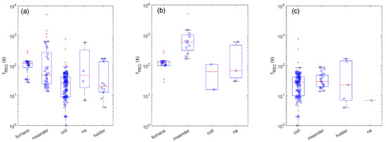 Figure 4 reports the boxplots resuming the distribution of tREC for different heating methods. At first, it is worth nothing that the different heating methods have not been evenly used with the dynamic and static setups. For example, the furnace has been used only in combination with the dynamic setup and not with the static one. On the other hand, the embedded coil as a heater has been widely used in combination with a static setup and has very rarely been used with the dynamic one. Moreover, it is interesting to observe that the meander-boxplot in Figure 4a is composed of two sub-clusters, one characterized by tREC > 100 s and the other by tREC < 100 s, which correspond to the meander-boxplots for the dynamic (Figure 4b) and static (Figure 4c) setups, respectively. These arguments have important implications for comparing the heating method effects on tREC.