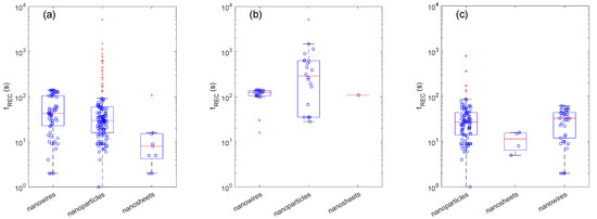 The morphological effects are shown in Figure 5. As was already observed for the heating method, the distributions of tREC for different morphologies also show a dependence on the gas delivery system. Indeed, the nanowire boxplot shown in Figure 5a is composed of two subgroups, one characterized by tREC > 100 s and the other by tREC < 100 s. With the exception of a few outliers, these two groups correspond to nanowires measured with a dynamic and a static setup, respectively. Moreover, in Figure 5a, the nanoparticle boxplot is characterized by a very large number of outliers, which strongly decreases the splitting of the dataset into those related to the static and dynamic setups.