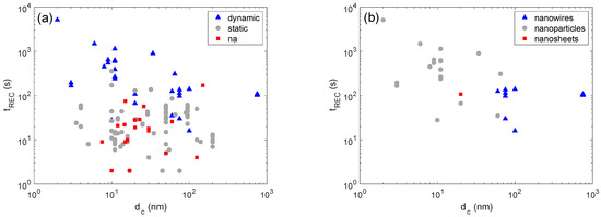 The effects of the crystallite size on tREC have been investigated in conjunction with the setup and crystallite morphology effect. Figure 6a shows that, if we look at the whole set of data, a clear relationship between tREC and dc does not emerge. The situation is different if we look at the data grouped by the adopted experimental setup. Concerning static setups, no clear trend emerges, but this may be due to the low tREC values of this type of setup, as was already observed in Figure 6 for morphological effects. Interestingly, for dynamic setups, a tendency of tREC to decrease as dc increases emerges. This tendency has been further investigated in conjunction with crystallite shape effects. Figure 6b shows that decoupling the two effects is not trivial. If we consider all the morphologies, a trend emerges, but the trend is less marked if we look at the nanowire and nanoparticle morphologies separately. Indeed, in statistical sense, the investigated nanowires have a diameter larger than that of the nanoparticles, and it is hard to assess whether the recovery time reduction is due to the size or shape effect or a combination of both. This difficulty may partially arise from the fact that both approaches, i.e., the use of nanostructures with larger diameters and the use of nanowires instead of nanoparticles, are beneficial for diffusion phenomena [11,12,53].