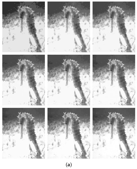 Figure 4a presents the visual results of the progressive decompression using the chosen test image. As more subimage bits reach the central server node, the visual quality of the reconstructed subimages progressively improves. The trend of the quantitative result from the progressive decompression in terms of peak signal-to-noise ratio (PSNR) value is presented in Figure 4b. It is clearly seen how the PSNR score increases as more subimages are received. Therefore, by establishing this agreement between the visual and quantitative results, the functionality of the progressive decompression is verified.