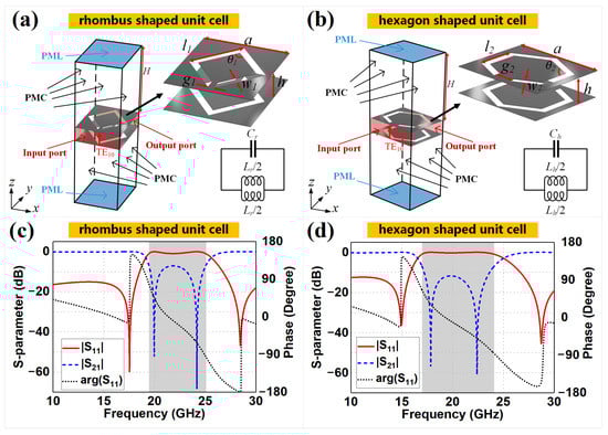 The Floquet model and corresponding equivalent circuits of the (a) rhombus- and (b) hexagon-shaped unit cells. Each unit has the dimensions of 2.5 mm × 2.5 mm × 0.787 mm and the substrate is chosen as RT5880 material, with relative permittivity of 2.2 and loss tangent of 0.001. Moreover, a = 2.5 mm, h = 0.787 mm, H = 3.75 mm, = 1.58 mm, = 1.2 mm, = , = , = 0.16 mm, = 0.5 mm, = 0.2 mm, and = 0.2 mm, based on the optimization results. The S-parameter of the (c) rhombus- and (d) hexagon-shaped unit cells is also provided.