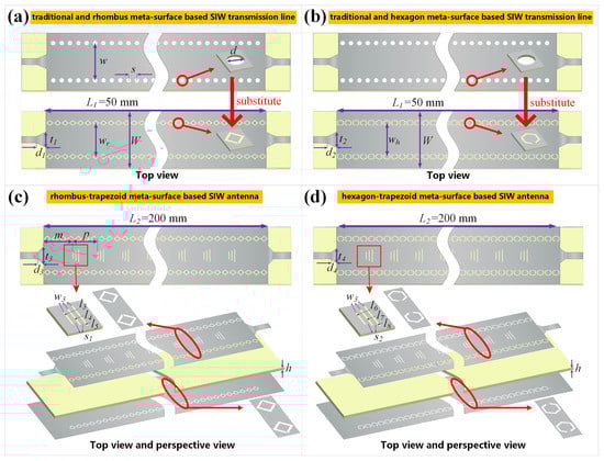 The coplanar (a) rhombus and (b) hexagon meta-surface-based SIW transmission lines compared with the traditional SIW structure, as well as the coplanar (c) rhombus–trapezoid and (d) hexagon–trapezoid meta-surface-based SIW leaky-wave antennas. The structural parameters are = 50 mm, W = 22 mm, = 6 mm, = 4 mm, = 13 mm, = 5 mm, = 2.5 mm, = 13 mm, = 200 mm, m = 9.4 mm, p = 8 mm, = 7 mm, = 1.8 mm, = 5.7 mm, = 1.7 mm, and h = 0.787 mm. For the trapezoid unit, the geometric sizes are set as: = 2.9 mm, = 3.9 mm, = 4.9 mm, = 0.9 mm, = 0.2 mm, = 3 mm, = 4 mm, = 5 mm, and = 1 mm.