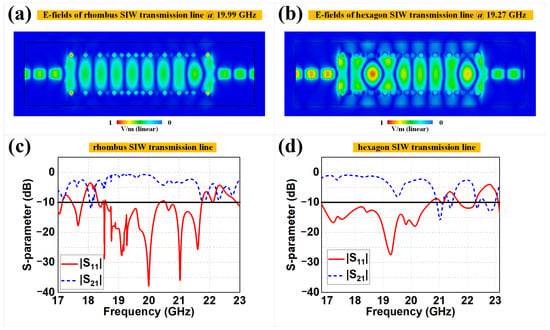 The E-field distributions of the (a) rhombus and (b) hexagon meta-surface-based SIW transmission lines, as well as the corresponding S-parameters of the (c) rhombus and (d) hexagon meta-surface-based SIW transmission lines.