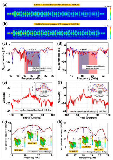 Figure 4a,b demonstrate the corresponding E-field distributions on the top plane of the rhombus and hexagon meta-surface-based SIW antennas at 19.60 GHz and 18.00 GHz, respectively. We can observe that the significant E-fields were distributed over the trapezoid-based meta-surfaces, which would excite high-gain radiations in the far-field. The field leakage at the sides still remained at a low level, as with the previous SIW lines. Figure 4c,d illustrate the corresponding S-parameters of the rhombus and hexagon SIW antennas with their comparison groups, respectively. In order to verify the effect of suppressing extra reflections from the trapezoid meta-surfaces, the traditional single-slot SIW antennas with the same external rhombus and hexagon meta-surface-based structures were also included in the simulations, for comparison purposes. Note that the proposed designs in Figure 4c,d and their comparison groups of single-slot structures should optimize the respective sizes of the microstrip transitions, achieving their best S-parameter performances. The −10 dB bandwidths of the trapezoid meta-surface designs are marked as red areas, while those of single-slot designs are marked as blue areas, and the intersections are marked as purple areas. We can observe that the trapezoid meta-surface designs had better reflection coefficients than the single-slot design, which proves that our trapezoid design enables better impedance matching through the transitions of the gradient slots. The rhombus–trapezoid design has values less than −10 dB ranging from 18.94 GHz to 21.09 GHz, with a minimum value of −50.04 dB at 19.31 GHz and a relative bandwidth of 10.74%, while the hexagon–trapezoid design has values less than −10 dB ranging from 17.20 GHz to 20.90 GHz, with a minimum value of −20.65 dB at 20.29 GHz and a relative bandwidth of 19.42%. We can also observe that the trapezoid meta-surface SIW antennas and the corresponding transmission lines showed similar trends in , indicating that the introduction of a trapezoidal meta-surface only affects the reflection coefficient, to a certain extent.