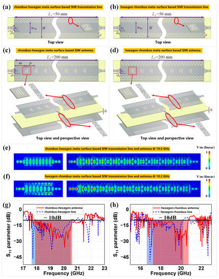 We extend our design to coplanar two-row based meta-surfaces by combining rhombus and hexagon structures in different orders, based on the original transmission lines and antennas in Figure 2. Figure 5a demonstrates the rhombus–hexagon meta-surface-based SIW transmission lines, where the rows of hexagon unit cells are etched at one cell spacing outside the rhombus cell rows of the original rhombus meta-surface-based SIW line. Similarly, Figure 5b demonstrates the opposite structure to Figure 5a, with hexagon rows inside and rhombus rows outside. Moreover, the same trapezoid-shaped meta-surfaces are also introduced to the two mixed SIW transmission lines, thus constructing the complex coplanar meta-surface combined SIW antennas shown in Figure 5c,d. Based on the optimization process of the original meta-surface-based SIWs, the four proposed designs in Figure 5 could use the optimized results from Figure 2 as initial values and further simulate and adjust specific geometric sizes such as transition sizes to obtain low reflections. The corresponding E-field distributions and parameters of the four proposed designs are illustrated in Figure 5e–h. We can observe, from the E-fields, that good mode transmission is achieved in each of the transmission lines and antennas, with less edge leakage compared to that shown in Figure 3 and Figure 4. The −10 dB bandwidths of the meta-surface-based antennas are marked as red areas, while those of transmission lines are marked as blue areas, and the intersections are marked as purple areas. The rhombus–hexagon transmission line in Figure 5a has values less than −10 dB ranging from 17.62 GHz to 20.50 GHz, with a minimum value of −46.22 dB at 17.71 GHz and a relative bandwidth of 15.11%, while the hexagon–rhombus transmission line in Figure 5b has values less than −10 dB ranging from 16.63 GHz to 20.21 GHz, with a minimum value of −49.39 dB at 16.95 GHz and a relative bandwidth of 19.44%. For the complex SIW antennas in Figure 5c,d, the corresponding ranges are from 17.89 GHz to 20.61 GHz with a minimum of −35.61 dB at 20.05 GHz and relative bandwidth of 14.13%, and from 17.24 GHz to 20.73 GHz with a minimum of −46.99 dB at 20.02 GHz and relative bandwidth of 18.38%. The original rhombus structures in Figure 2a,c concentrate on obtaining lower reflections, while the new rhombus–hexagon designs in Figure 5a,c increase the bandwidth on this basis. Similarly, the original hexagon structures in Figure 2b,d have significantly wider bands with acceptable reflections, while the hexagon–rhombus designs in Figure 5b,d retain these broad bands and achieve greatly reduced reflections at specific frequencies. These different results are mainly attributed to the primary shielding effect of the inside meta-surfaces and the secondary shielding effect of the outside meta-surfaces, where the primary meta-unit rows determine the overall transmission performance and the secondary cells fine-tune the reflections on this basis. As a result, all of the proposed devices obtain good reflection and bandwidth, but with different priority.