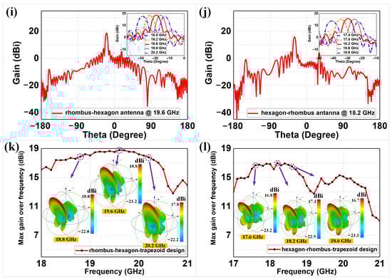 Figure 4e–h continue to illustrate the two- and three-dimensional far-field radiation patterns of the coplanar trapezoid meta-surface-based SIW antennas, as well as the maximum gains over frequencies. We can observe that both the proposed designs generate highly directive fan beams and achieve satisfactory beam scanning within their operating frequency bands. For example, at the frequencies of 19.6 GHz and 18.0 GHz, the maximum gains of the rhombus and hexagon SIW antennas were 18.10 dBi and 17.00 dBi, respectively. The radiation efficiency and aperture efficiency thus could be obtained through comparing the gains to the directivity or aperture of the antenna. To be more specific, the radiation efficiency is calculated from the ratio of gain to directivity, expressed as , where the directivity can be obtained from the simulations [63,64,65]. Meanwhile, the aperture efficiency of the meta-surface-based SIW antenna can be calculated by , where A is the physical aperture of the antenna [66,67,68]. Therefore, the radiation efficiencies of the rhombus–trapezoid and hexagon–trapezoid SIW antennas are 87.10% and 81.28%, respectively, and the corresponding aperture efficiencies are 52.02% and 47.88%, respectively. The rhombus–trapezoid design has a 3-dB beamwidth of in the E-plane and in the H-plane, while the hexagon–trapezoid design has a 3-dB beamwidth of in the E-plane and in the H-plane. We can also observe that the beam-scanning performances of the two proposed antennas are well demonstrated when the operating frequency varies within certain ranges with high-gain performance. The rhombus–trapezoid meta-surface-based SIW antenna has scanning beams in , , , and at 19.2 GHz, 19.4 GHz, 19.6 GHz, 19.8 GHz and 20.0 GHz, respectively, while the hexagon–trapezoid design has scanning beams in , , , and at 17.2 GHz, 17.6 GHz, 18.0 GHz, 18.4 GHz and 18.8 GHz, respectively. Every 0.4 GHz frequency offset would result in beam steering for the rhombus antenna and beam steering for the hexagon antenna. Some of the three-dimensional radiation patterns are shown in Figure 4g,h. Both the rhombus–trapezoid- and hexagon–trapezoid-shaped antennas maintain high-gain radiations over the examined bandwidth, from 19.0 GHz to 20 GHz and from 17.0 GHz to 18.8 GHz, respectively. Although there are some fluctuations in the maximum gains, this is reasonable, as the electromagnetic responses from the meta-surfaces vary with frequency.