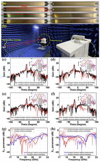 Finally, we fabricated the coplanar rhombus, hexagon, rhombus–hexagon and hexagon–rhombus meta-surface-based SIW leaky-wave antennas and carried out corresponding experiments in a microwave chamber to verify the proposed designs, as shown in Figure 6a,b. Through simple copper cladding and etching technology, the meta-surfaces and microstrip structures were printed on both sides of the substrate slabs. In addition, standard SMA connectors were soldered on both ends of the substrates for feeding excitation. The four meta-surface-based SIW antennas under test with equal height to the receiving antenna were set as transmit antennas and properly assembled on the center position of the turntable. A vector network analyzer was applied for measuring the reflection coefficients of the proposed antennas, and a standard diagonal horn antenna with the distance of 3.72 m to the center of the turntable was utilized to receive the electromagnetic fields and measure the radiation performance. The experimental far-field radiation results of four proposed SIW antennas are demonstrated in Figure 6c–f, with a comparison to the corresponding simulations. We can observe that all proposed antennas demonstrated highly directive radiation and beam-scanning performance, as designed. The measured gain values of the center frequencies were 17.06 dBi, 15.79 dBi, 17.9 dBi and 15.97 dBi at 19.6 GHz, 18 GHz, 19.6 GHz and 18.2 GHz, respectively, as shown in Figure 6c–f. Based on these gain results, we could calculate the measured radiation efficiencies of the rhombus, hexagon, rhombus–hexagon and hexagon–rhombus meta-surface-based SIW antennas as 68.55%, 61.52%, 74.13% and 64.12%, and the measured aperture efficiencies were 40.94%, 36.23%, 49.68% and 36.94%, using the same methods as those for calculating the simulated radiation and aperture efficiencies. The measured efficiencies are approximately 10–18% lower than the simulated efficiencies. The corresponding beam-scanning measurements are also illustrated, with nearly the same frequency ranges as in Figure 4 and Figure 5. The corresponding results are shown in Figure 6g,h with a comparison to the corresponding simulations, where the trends of the S-parameter curves are similar to those in the original simulations, achieving their different bandwidth design aims. For Figure 6g, the rhombus SIW antenna has values less than −10 dB ranging from 18.05 GHz to 21.1 GHz, with a minimum value of −49.35 dB at 18.55 GHz and relative bandwidth of 15.58%. Meanwhile, the hexagon SIW antenna has values less than −10 dB ranging from 16.20 GHz to 21.40 GHz, with a minimum value of −30.33 dB at 17.45 GHz and relative bandwidth of 27.66%. For Figure 6h, the rhombus–hexagon SIW antenna has values less than −10 dB ranging from 17.35 GHz to 21.00 GHz, with a minimum value of −34.57 dB at 17.85 GHz and relative bandwidth of 19.04%. Meanwhile, the hexagon–rhombus SIW antenna has values less than −10 dB ranging from 16.80 GHz to 20.95 GHz, with a minimum value of −23.04 dB at 20.65 GHz and relative bandwidth of 21.99%. We can observe that the measured gains and S-parameters were mostly in agreement with the simulations, with only a few degradations or frequency shifts. As a result, there are some discrepancies in the simulated and measured results from the proposed antennas. These degradations were mainly attributed to the fabrication tolerance of the meta-surfaces, the welding quality of the SMA connectors and the measurement deviations. The fabrication tolerance could affect the geometric sizes and substrate electromagnetic properties of the unit cells, which would result in discrepancies in the electromagnetic response from the meta-surfaces. The welding quality would affect the transmission characteristics of the SMAs, which in turn affects the radiation performance of the antennas. Moreover, the potential antenna deformation during the measurement and the effects of fixed brackets on electromagnetic waves could also lead to measurement deviations. However, all four of the proposed meta-surface-based SIW antennas demonstrated their beam-scanning ability, with flexible reflection coefficients and bandwidths.