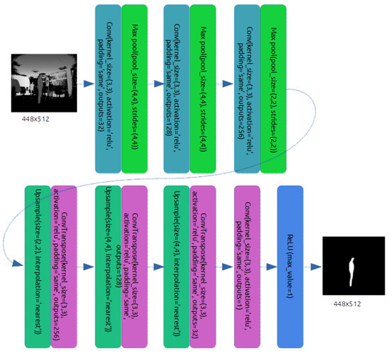 This article presented an abridged VGG-based reflected architecture for segmentation training, which is named Agrast-6 (“Agrastas” means “gooseberry” in Lithuanian). It has six encoder layers, seven decoder layers and a ReLU activation layer, which reduces the number of trainable parameters by a factor of 27 in comparison with SegNet [32]. However, the problem of binary segmentation is less complex than semantic segmentation, which allows a simpler network, which, in turn, reduces the time required for training significantly. The simpler model did not cause low accuracy, as even after nine epochs of training, this model already achieves binary segmentation accuracy comparable to much heavier state-of-the-art models. The Agrast-6 architecture has been trained using a real-life indoor dataset collected using a Kinect camera, where one person is semantically an obvious foreground and has shown the average cross-intersection accuracy of 86% and mIoU of 87% at segmenting the data. This means a much higher accuracy per parameter (70% accuracy per 1,000,000 parameters), which is impossible to achieve with large architectures. This could be further increased using more training epochs, as test accuracy and precision metrics have still been increasing.