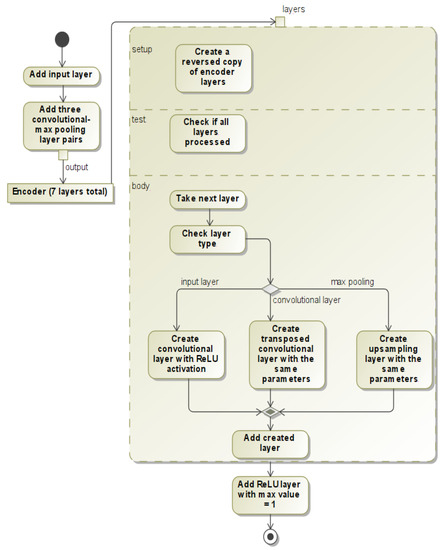 The decoder is automatically generated from the encoder. The decoder generator iterates over the encoder layers in reverse and produces new layers. The upsampling layer is generated if a max pooling layer is found; the deconvolutional layer is generated if a convolutional layer is found; the ReLU layer is generated if an input layer is found. This process is shown as a UML activity diagram in Figure 2. It outputs the network shown in Figure 1 and guarantees that the architecture is mirrored. Copied parameters for convolutional–transposed convolutional layers are filters, kernel size, activation and padding. The upsampling layers are generated by setting the size of the layer as encoder strides. The final transposed convolutional layer has 1 filter, a 3 × 3 kernel size and ReLU activation.