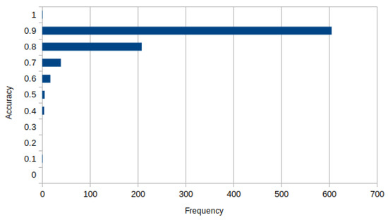 It was found that the average score of cross-set intersection is 85.7% while mIoU is 86.5%. However, most of the per-sequence cross-set intersection accuracy values (69%) fall into the 90–100% accuracy category. In addition, 7.5% of the frame sequences were processed at the accuracy of less than 80%. A detailed distribution of accuracy values is shown in Figure 5.