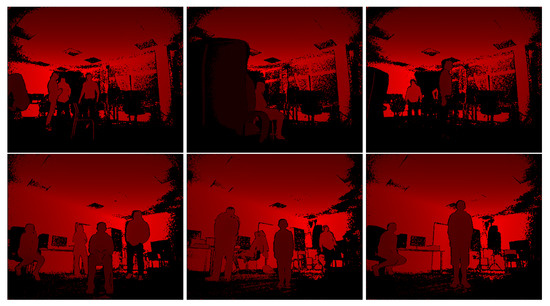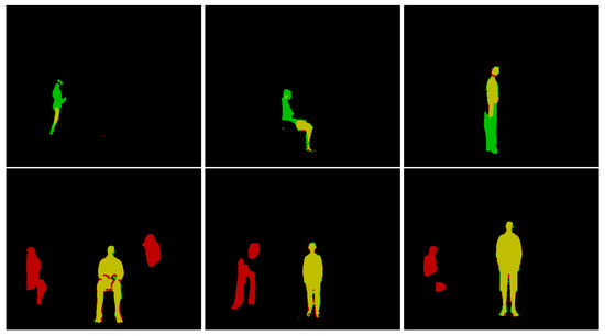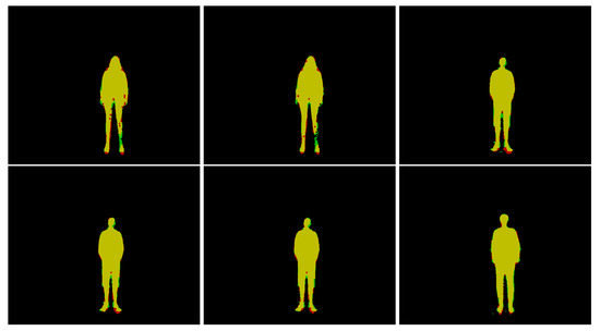 Some examples of errors made by Agrast-6 are provided in Figure 8. The first two images show examples where the network almost completely failed to segment the depth image. Only the thigh was included in the output for the first image (yellow color shows the correctly segmented part of the body), and the legs were included in the second example. The person in the second image was partially occluded by another object, which may have caused troubles in segmenting the output. The third image is an example with the black jeans—the whole bottom part of the body was not included in the segmentation output, which shows that the network has not yet learnt this type of noise in “Kinect” depth images. The bottom row shows images where the person was segmented correctly or almost correctly, but extra artifacts were included in the segmentation output (shown in red). These objects have shapes somewhat similar to the human body and were mistakenly included as a human body. However, the first five images are from the bottom 1% of the images by accuracy while the last one is in the bottom 7%. Therefore, these mistakes are made only in some cases. Figure 9 showcases depth as seen by the camera for these images.