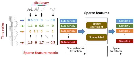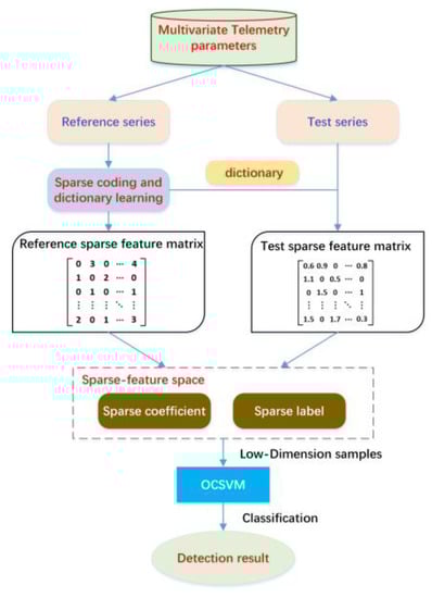 The SFAD method shown in Figure 2, can be divided into two parts, offline and online. In the offline part, dictionary learning algorithms are used to capture normal patterns (i.e., atoms) from the reference spacecraft’s multivariate telemetry data while producing a reference sparse feature matrix describing the local dynamics and co-occurrence relations of telemetry parameters. Then, defined sparse features (i.e., sparse coefficients and sparse labels) are extracted from the sparse feature matrix to reduce the feature dimension, as shown in Figure 3. In the online part, the online monitoring of the telemetry parameter data can be sparsely coded with the dictionary learned from reference data that do not contain any anomalies. Similarly, the online sparse matrix is transformed into a sparse feature space. Finally, we identify anomalies using OCSVM on the sparse feature space. According to the above description, sparse features drastically reduce the size of the multidimensional sequences in a sliding window while retaining the local dynamics and co-occurrence relations. By feeding lower-dimensional samples to the OCSVM, the accuracy and efficiency of detection can be markedly improved, which is suitable for online detection.