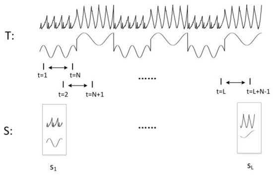 The multivariate anomaly detection framework requires that we cannot consider sample points separately, and must consider time-domain and correlation characteristics over a duration. This study uses a sliding window technique to segment multidimensional sequences in telemetry, as shown in Figure 4. Telemetry time series (i.e., , where is the number of telemetry parameters) are assumed to be segmented into windows with a fixed size with a shift of 1 and an overlapping area equal to . Each window matrix is concatenated into vectors as a sample vector , . Then, sample vectors are concatenated by time step as a sample matrix , where .