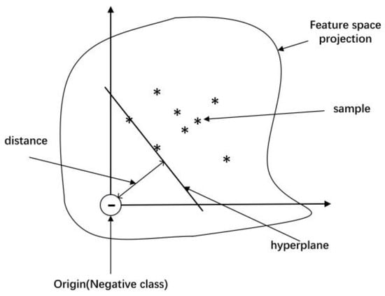 One-class support vector machines were first proposed by Schölkopf to solve the single classification task [31]. As shown in Figure 6, the essential concept of the OCSVM algorithm is to map the samples in a higher-dimensional subspace and then to find a hyperplane in this subspace separating the one-class samples from the origin, which in this case involves maximizing the distance from the hyperplane to the origin while separating most of the one-class samples. For a new sample, if it is over the hyperplane (i.e., away from the origin) it is classified as the positive class, and vice versa.