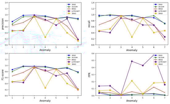 Table 2 and Table 3 show the evaluation effectiveness indicators for all methods of anomaly detection. The visualized results are shown in Figure 8. Comparing the indicators in Table 2 and Table 3 shows that the proposed SFAD method performs better than the other methods, primarily due to its higher precision, higher F1-score, and lower FPR. The latter is particularly important for spacecraft health monitoring, because too many false alarms are a problem for operational missions. In particular, the indicators are markedly improved in collective anomalies and correlation anomalies. From Figure 8, it can be seen that among the five methods the OCSVM-based methods are more accurate than the predicted method and sparse-based method. All of the lines of SFAD are stable, indicating better robustness and stability. In contrast, the other methods have limitations for certain abnormal datasets, leading to fluctuations in indicators.