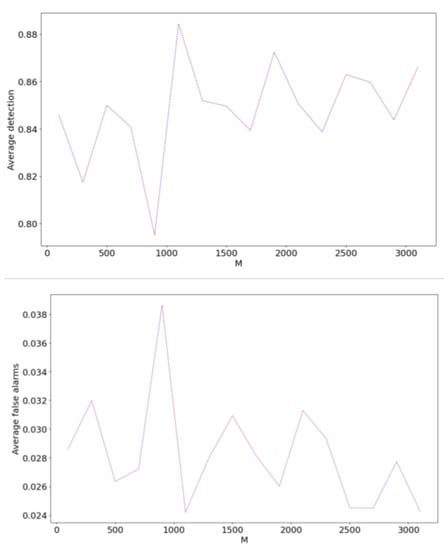 As the number of atoms in the dictionary increases, indicators fluctuate and the general performance starts improving. For example, moving from 100 to 900 atoms, the average detection rate and average false alarms are 82.98% and 3.06% respectively. Beyond 1100 atoms, the corresponding indicators are 85.63% and 2.72% respectively, which is an improvement in general performance. It can be concluded that increasing the number of atoms leads to higher detection performance, however, this increase is not sustainable. Too many atoms in the dictionary may not improve the detection performance, instead wasting computing resources. Considering the balance between the detection effect and computing resources, we chose M = 1100 for this study. This analysis emphasizes that choosing the number of atoms in the dictionary is important for anomaly detection using SFAD.