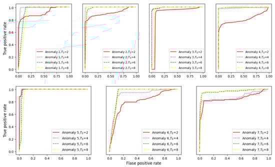 This section explains how the proposed SFAD method determines the sparse degree in the sparse coding algorithm. In the proposed method, the sparse degree affects the effect of sparse representation and determines the size of the sparse features; thus, considering the choice of the sparse degree is important for anomaly detection using SFAD. In an experiment, we set different sparse degree values () and determined the best value using ROCs to express the true positive rate as a function of the false positive rate. Figure 10 shows the ROCs with different for the seven anomaly datasets. The larger the area under the ROC curve is, the better the detection performance of the model. Among the four values, performs the worst; next, all achieve good performances effects on anomalies 1–5; however, is worse than on anomalies 6 and 7. Considering that leads to a good compromise in terms of performance and computational complexity (the higher is, the higher the computation time), we used with the sparse coding algorithm in this study. This analysis shows that a sparse degree that is too small results in poor performance in sparse representation and ignores necessary features as input to OCSVM, while an excessive sparse degree markedly adds to interference information during modelling and increases computational complexity. These results confirm that choosing a reasonable sparse degree in the sparse coding algorithm is important for anomaly detection using SFAD.