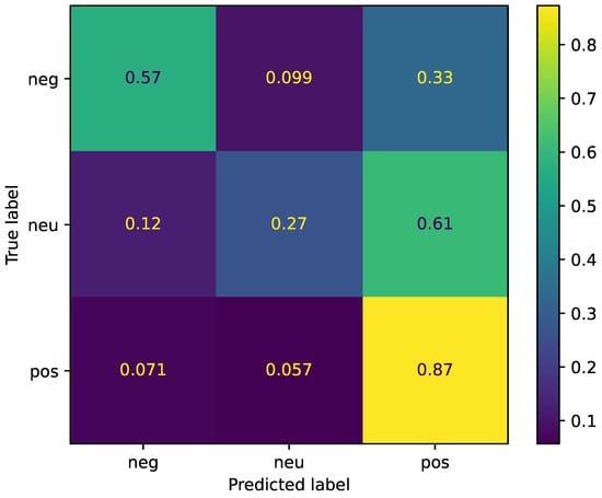 For the three-task sentiment analysis, the confusion matrix is shown in Figure 3. It can be observed that the performance in regard to negative sentiment improved (from 53% to 57%), whereas the performance in regard to positive sentiment decreased (from 93% to 87%). An interesting result is the low performance in relation to neutral sentiment (27%) with the 5100 samples. This number was included among the positive sample group in the previous two-class sentiment analysis (here, the positive sample was split into positive and neutral samples). There is a debate in psychological research as to whether neutral affect exists [19] or does not exist [20]. Our results support the second theory, as indicated by the fact that the two-class sentiment analysis gained more feasible (by WA, for practice) and reliable (by UA, for details) results than the three-class sentiment analysis with a neutral state.