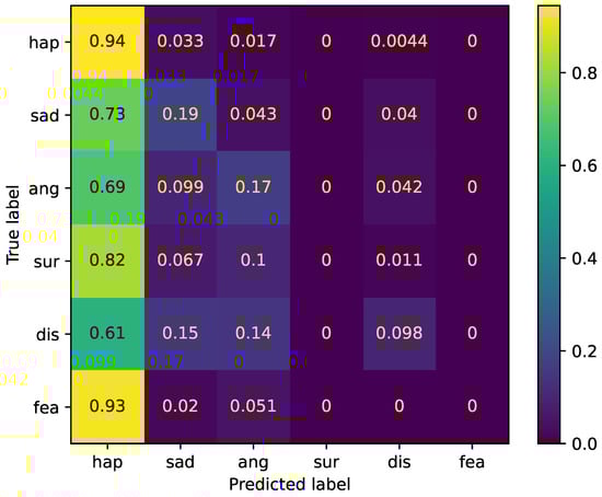 The confusion matrix of the six-class emotion recognition task is shown in Figure 4. In this task, the score of WA showed moderate accuracy (64%). However, the confusion matrix shows that the (large) model failed in the recognition of emotional categories except for happiness, where it achieved 94% accuracy/recall. The reason for these failed predictions was the large size of the happiness sample; more than half of the data (14,567 samples, 63%) were labeled as happy.