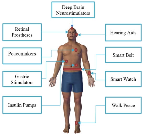 Biomedical devices (wearable and implantable) have expanded in popularity in integrating digital health for a diversity of biomedical applications, which includes the sensing, tracking, and monitoring of vital signals for continuous monitoring, thus making it possible for early intervention. In the healthcare sector, the advancement in these technologies is a result of several factors such as the increasing population of people with chronic diseases (such as diabetes and obesity), the aging population, and the rising need for real-time health monitoring, including fitness and wellness [1]. Recent developments in integrated circuits, medical sensors, wireless communications, and fabrication methods enable small, low-power devices with special interfacing capabilities to interact with human tissues and biological objects [2]. The platforms offered by these interfaces are appropriate for the quantitative measurement, continuous observation, and documentation of physiological and biomedical parameters, as well as for the modification of cells, tissues, or organs. Figure 1 shows different biomedical devices used in various body locations. The devices are usually powered by conventional batteries that are either rechargeable or can be replaced periodically [3]. Battery technology has advanced and now offers compact sizes with high energy capacities. However, the functional lifespan of the batteries is still relatively short and demands frequent replacement. Additionally, it is adverse and impractical to entirely power these biomedical devices with conventional batteries, especially the stretchable devices which are too small and thin to even accommodate a battery. Another issue is that the process involved in replacing the battery of these devices may trigger unnecessary side effects such as infection, inflammation, internal bleeding, and prolonged recovery [4]. Consequently, the significant challenge of these small-scale wearable and IMDs is to have a sufficient sustainable power source that is stable, biocompatible, and with no side effects. Renewable energy sources, such as RFEH technology, have great potential to fulfill the above requirements because the ambient or near-field RF energy are ubiquitous and always available. RFEH technology is based on scavenging the electromagnetic energy from RF signals. This technology enables self-sustained or battery-assisted biomedical devices with an extended lifespan. The RF wave is available in both outdoors and indoors, in urban, suburban, and rural regions. RF sources can be categorized into the following categories: ambient sources (e.g., near cell phone towers) and dedicated/nearfield sources such as Powercast TX91501-3WID in a wireless powered communication network [5]. An ambient source emits stable output power to supply wireless sensors irrespective of the transmission frequency. On the other hand, a dedicated source provides a predefined energy supply to the device by optimizing the frequency and maximum power transfer to replenish sufficient power for the sensor devices.
