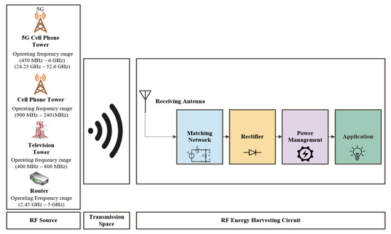 A typical RFEH system comprises a receiving antenna, a matching circuit, a rectifier, a power management unit (PMU), and the load, as illustrated in Figure 2. The receiving antenna captures the incident RF power, whereas the role of the rectifier circuit is to convert the received RF to DC. In addition, a matching circuit is required to maximize the received input power. PMU stocks and manages the harvested RF energy and also supplies the load.