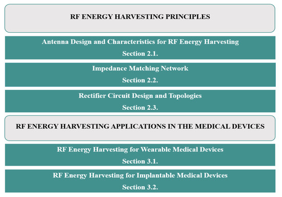 The recently published review papers on energy harvesting for biomedical devices [24,25,26,27,28,29] investigate multiple technologies to power up these devices. To the best of our knowledge, this is the first review that extensively discusses and focuses on recent RF energy harvesting technologies to power up wearable and IMDs. Figure 3 illustrates the organization of this review, in which Section 2 presents the operation principle of the RFEH system, antenna design and characteristics, impedance matching network, and rectifier topologies. Section 3 highlights the application of RFEH in wearable and IMDs, followed by the conclusion.