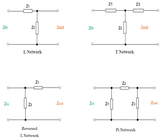 The impedance matching network is employed to prevent power leakage, and it guarantees maximum power transmission between the source of energy and the load. To achieve maximum power transfer, the impedance of the output antenna should be identical to the load impedance. The incident wave at the load will be reflected when an impedance mismatch leads to reduced efficiency. In the RFEH system, the receiver antenna acts as an RF source, while the rectifier represents the load. The impedance matching network concurrently functions as a low-pass filter in suppressing higher-order harmonics generated by the rectifying circuit, which can be re-radiated by the antenna, causing additional loss [103]. A perfect matching network for the RFEH should achieve impedance matching between the source and the load with minimum insertion loss and at any input power, frequency, and load resistance. Matching networks are classified into three configurations, which are L, Pi, and T configurations, as shown in Figure 4. The commonly used configuration is L, with two components that ease the control process and design. Moreover, the quality factor Q is sustained in the L configuration. In comparison to the L network, the T and Pi matching designs are more complex. Additionally, organizing the T and Pi configurations into numerous stages preserves the final matching outcomes but will alter the Q factor. This method is advantageous for improving passive voltage boosting.