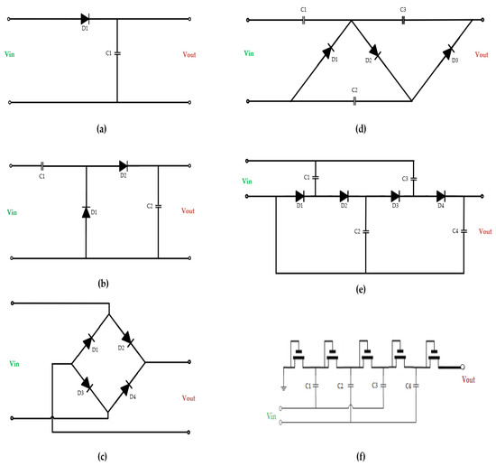 Various rectifier topologies: (a) circuit diagram of half-wave rectifier; (b) circuit diagram of full-wave rectifier; (c) circuit diagram of bridge rectifier; (d) circuit diagram of three-stages Cockcroft–Walton voltage multiplier; (e) circuit diagram of four-stages Dickson voltage multiplier; (f) circuit diagram of four-stages Dickson voltage multiplier utilizing CMOS technology.