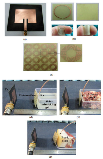 Prototype and measurement setup of implantable WPT system: (a) fabricated Tx patch antenna; (b) fabricated RX implantable loop antenna; (c) metasurface design of 4 × 4 unit cell array; (d) testing RX element inside skin-mimicking gel; (e) testing RX element inside minced pork; (f) testing RX element inside pork slab [175].