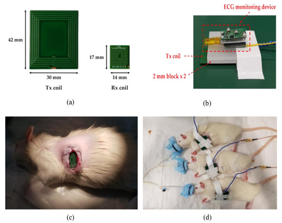 In the conventional near-field inductive and resonant coupling [167,168,169], an optimized design of a transmitter coil is important to increase the wireless power transfer (WPT) efficiency. Power leakage is an additional impediment restraining the widespread use of WPT. The power leakage potentially causes failure to other medical devices [170], posing serious health risks. The conventional inductive coupling method can contribute to the focusing of magnetic field in a specific focal region within human tissue. For instance, the low-frequency inductive coupling has been used for wireless telemetry of IMDs since lower frequencies have better penetration in the tissues [171]. Despite the wide use of near-field energy harvesting by the reported research works, there are some bottlenecks in adopting this system. The system requires consistent calibration, accuracy, and alignment between the transmitter and receiver coils, where the distance between IMDs and the power supply must be only few centimeters. However, studies in [172,173] adopted the radiative near-field (RNF) region (Fresnel zone) of the transmitter Tx, which is less sensitive to Tx–Rx misalignments. The IMDs that use the RNF WPT technique are powered at the operating frequencies of 1.9 GHz and 2.4 GHz. Moreover, the devices are incorporated with an antenna, rather than spiral coils, to capture the RF energy. The work reported in [173] used the RNF technique to eliminate the alignment issue with power of the sensor devices enabled wirelessly from the near-field radiating patch antennas. Shah et al. [174] designed a miniaturized wireless IMD that uses the RNF WPT technology for wireless monitoring elevated intracranial pressure (WICP). The prototype of this device comprises an Rx antenna, a styrofoam spacer, dummy PEC elements realized as a dual layer PCB, and an alumina container. The power transfer efficiency (PTE) of the IMD was measured in terms of distance variations. The maximum achieved PTE was −25.9 dB at 20 mm (0.1267) Tx–Rx separation. The setup to demonstrate the performance of WPT comprises an external RF transmitter coil, a receiver antenna immersed in saline solution, a rectifier circuit, and a green LED employed as a DC load. The work reported by [175] proposed a metasurface-based technique to improve the efficiency of the RNF WPT system. The technique is based on using the high refractive index of the metasurface to improve the PTE. The metasurface, which includes a transmitting patch and a receiving implantable loop antenna (see Figure 7a–c), is positioned above the surface of the skin layer in the WPT link. The Rx element is located in a skin-mimicking gel, minced pork, and a pork slab incorporated with a metasurface, as described in Figure 7d–f. The system exhibited a PTE of 1.26% for the skin-mimicking gel. To extend the operating distance in the near-field WPT, the work reported by [176] proposed a synchronized biventricular (BiV) pacing in a leadless fashion by implementing miniaturized and inductively powered pacemakers. An integrated circuit design was employed to reduce the power consumption of these pacemakers, which significantly increased the maximum operating distance to 8.5 cm and 11 cm from 1 W Tx power at frequency bands of 40.68 MHz and 13.56 MHz, respectively. Junho et al. [177] used an inductive coupling method for the WPT system to recharge an implantable ECG monitoring device continuously for 23.6 h. The Tx and Rx coils were fabricated to charge the battery wirelessly, as depicted in Figure 8a. The mainboard, a battery, and the Rx coil were positioned together similarly to the ECG monitoring system, with the coil spacing set at 4 mm, taking into account the animal testing situations as illustrated in Figure 8b. The proposed ECG monitoring device was implanted into a rat to measure and transmit the ECG, as shown in Figure 8c,d. The WPT system achieved a charging voltage of 4.2 V with a PTE of 10% at an input power of 1.8 W. However, the WPT system suffers from electromagnetic interference. The biopotential is small and, thus, it is exposed to noise, such as 60 Hz, from the power line. As a result, the ECG was not measured accurately while utilizing the WPT.