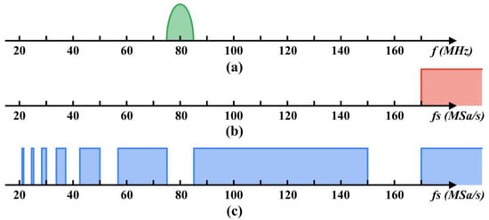 Since the beat signal is a bandpass signal whose center frequency is , the undersampling technique can be applied to replace the Nyquist–Shannon sampling theorem during the data-acquisition process in conventional heterodyne Φ-OTDR. The sampling process is a periodic expansion of the signal spectrum at intervals of the sampling rate. By using a selected sampling rate, it is feasible to complete the signal acquisition process while avoiding spectral aliasing at a relatively low sampling rate. According to [24], the range of the undersampling rate should satisfy the following inequation: