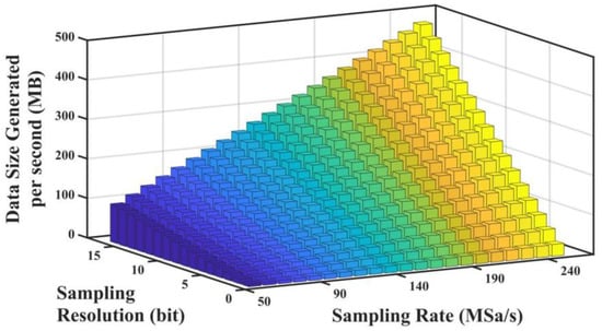 As depicted in (3), the impact of external perturbations on the sensing fiber was reflected in the phase variation of the RBS light, and the waveform of the perturbations could be obtained by extracting its phase information. Therefore, the precision of the amplitude of could be reduced sufficiently to diminish the size of each sample during the data-acquisition process [25]. In summary, the undersampling theorem enabled the use of lower sampling rates for data acquisition, which reduced the number of samples captured per second; on the other hand, the ultra-low sampling resolution technique offered a significant reduction in the file size of individual samples. The amount of data generated per second under the different sampling rates and sampling resolutions is illustrated in Figure 2, and we can see that the sampling rate and sampling resolution had a large impact on the amount of data produced per second. Therefore, combining the ultra-low sampling resolution and undersampling techniques to properly decrease the applied sampling rate and resolution presented a highly promising data-reduction solution for the heterodyne Φ-OTDR system.