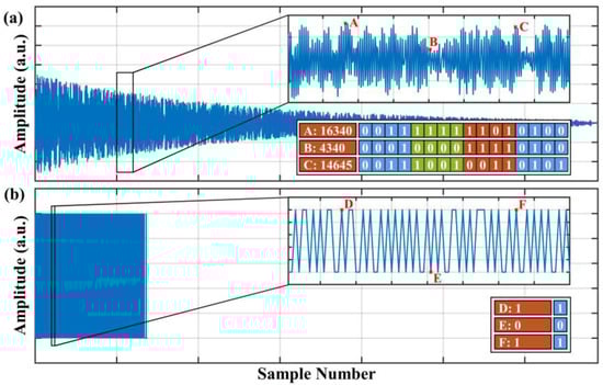 Figure 3 demonstrates the comparison of a conventional trace and the trace after the undersampling and ultra-low-resolution processing. The illustrated conventional trace in Figure 3a was filtered by a bandpass filter, and the sampling rate of this trace was 250 MSa/s. By extracting a fixed-position sample out of every five samples, we obtained the undersampled trace in Figure 3b, whose sampling rate was 50 MSa/s. It could be figured out that the number of samples in the undersampled trace was a fifth of that of the conventional trace. Specifically, the inset in Figure 3a had 400 samples, and the corresponding data in the undersampled trace had only 80 samples, as shown in the inset in Figure 3b. In addition, the samples in Figure 3b were all represented by only 1 bit instead of 16 bits as in Figure 3a, which decreased the storage space by a sixteenth for each sample. The resolution conversion process was implemented by a binary switch, which assigned 1 to samples that exceeded the threshold and 0 otherwise. In addition, the threshold was defined as the average value of this trace. Based on the above discussion, we concluded that the volume of data in the undersampled 1-bit-resolution trace in Figure 3b was an eightieth of that in Figure 3a, which was a considerable reduction rate. It should be noted that this process could be implemented by an inexpensive data-acquisition device with a low sampling rate and a low sampling resolution in practical applications.