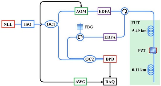 A single-point sensing experiment was conducted to verify the feasibility of this data-reduction solution. The experimental setup was a conventional heterodyne Φ-OTDR scheme, as shown in Figure 4. A 5 kHz narrow-linewidth laser (NLL) with 23 mW output power was adopted as the light source, which emitted a continuous light to an isolator (ISO). After passing through the ISO, the continuous light was divided into two parts by a 10:90 optical coupler (OC). Then, 10% of the light acted as the local reference signal and 90% of the light was fed into the acousto-optic modulator (AOM), which turned it into probe pulses with 100 ns pulse widths. The frequency shift of the AOM was 80 MHz, and the repetition rate was set at 16 kHz. The probe pulses were amplified by an Erbium-doped fiber amplifier (EDFA) and then launched into the fiber under test (FUT) through an optical circulator. The FUT was composed of three sections. The first and last parts were single-mode fibers with a length of 5.49 km and 0.11 km, respectively, and the middle section was a homemade piezoelectric transducer (PZT) with a 5 m fiber wrapped around it, which was used to generate the dynamic strain on the FUT. The PZT was driven by a 1 kHz sinusoidal signal with a voltage of 3 V. The RBS light that was returned from the sensing fiber was amplified again by another EDFA and then filtered by an FBG to remove the amplified spontaneous emission noise. The local reference light interfered with the RBS light at a 50:50 coupler, resulting in a beat signal with a center frequency of 80 MHz. The beat signal was then converted to an electrical signal by a balanced photodetector (BPD) with a bandwidth of 300 MHz.