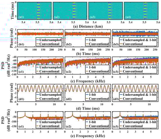 (a) Demodulated differential phase by (a1) the conventional process, (a2) the undersampling technique, (a3) the 1-bit sampling resolution technique, and (a4) a combination of these two techniques, respectively; (b) time-domain phase waveform in the undisturbed fiber section, and (c) corresponding PSD results; (d) time-domain vibration waveform, and (e) corresponding PSD results.
